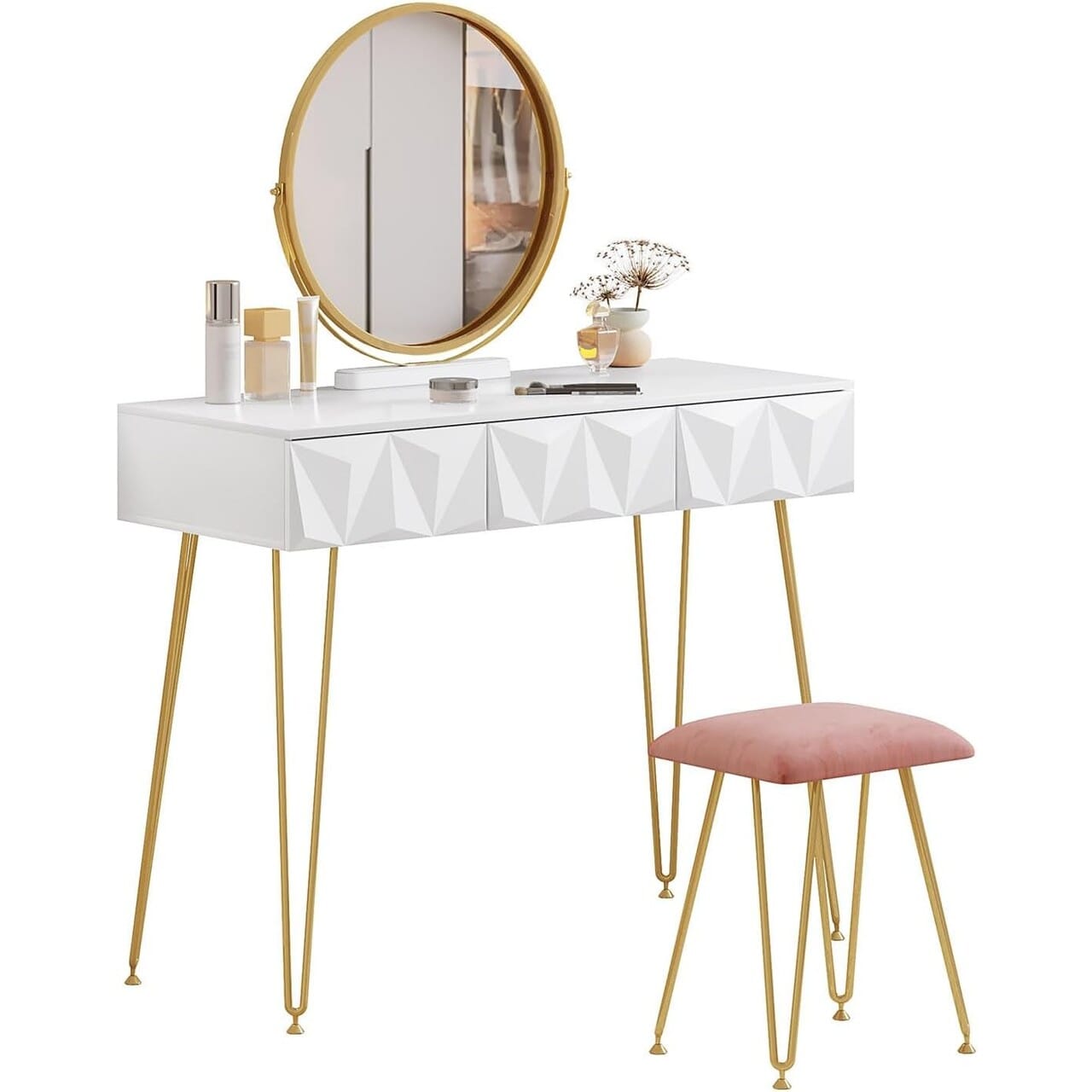- Ein auffälliges Design: Der schlichte Look und die Kombination aus Weiß, Gold und Rosa machen das Schminktisch-Set elegant und stilvoll. Die goldenen Haarnadelbeine und das Rautenmuster auf den Schubladen verleihen dem Set einen Hauch von Luxus