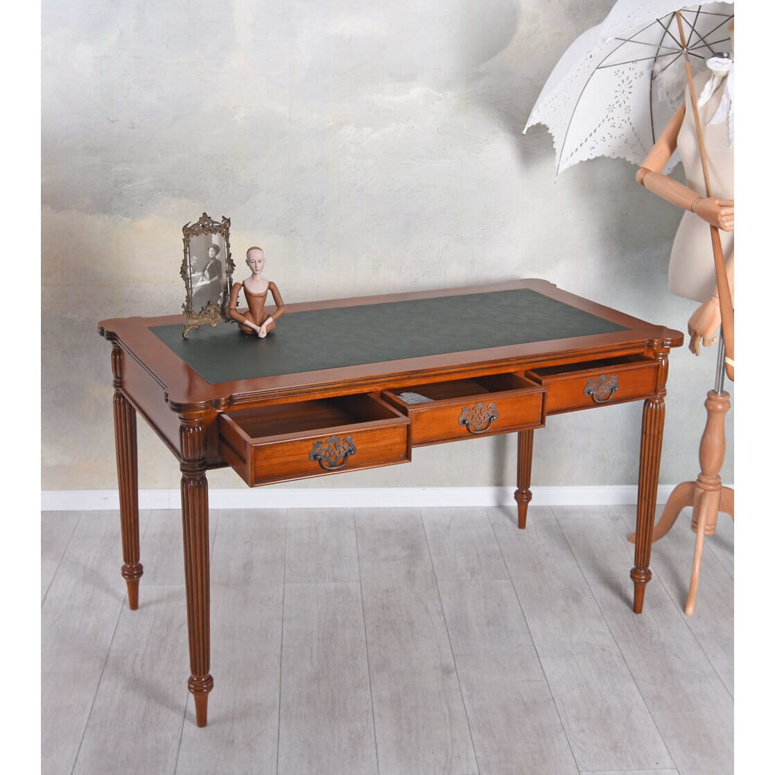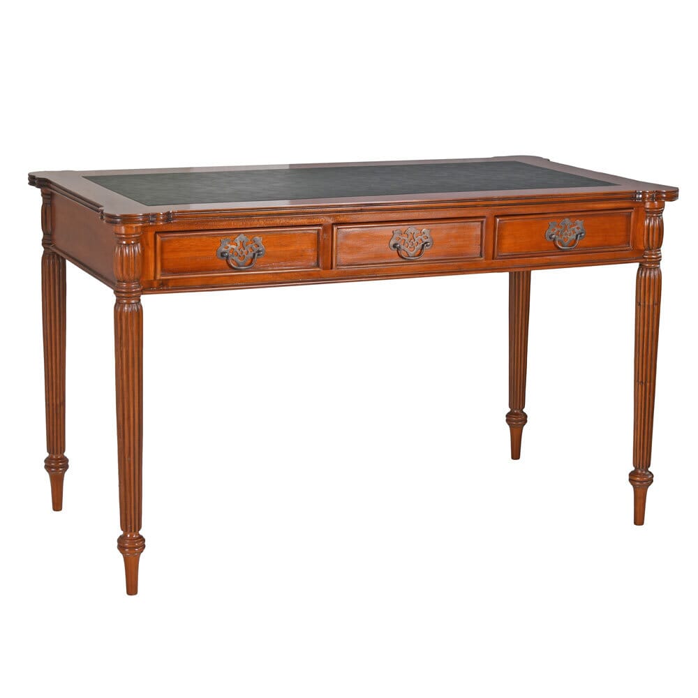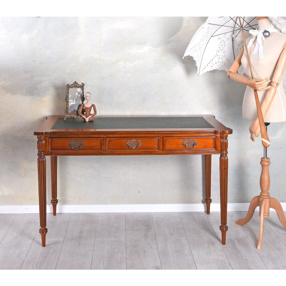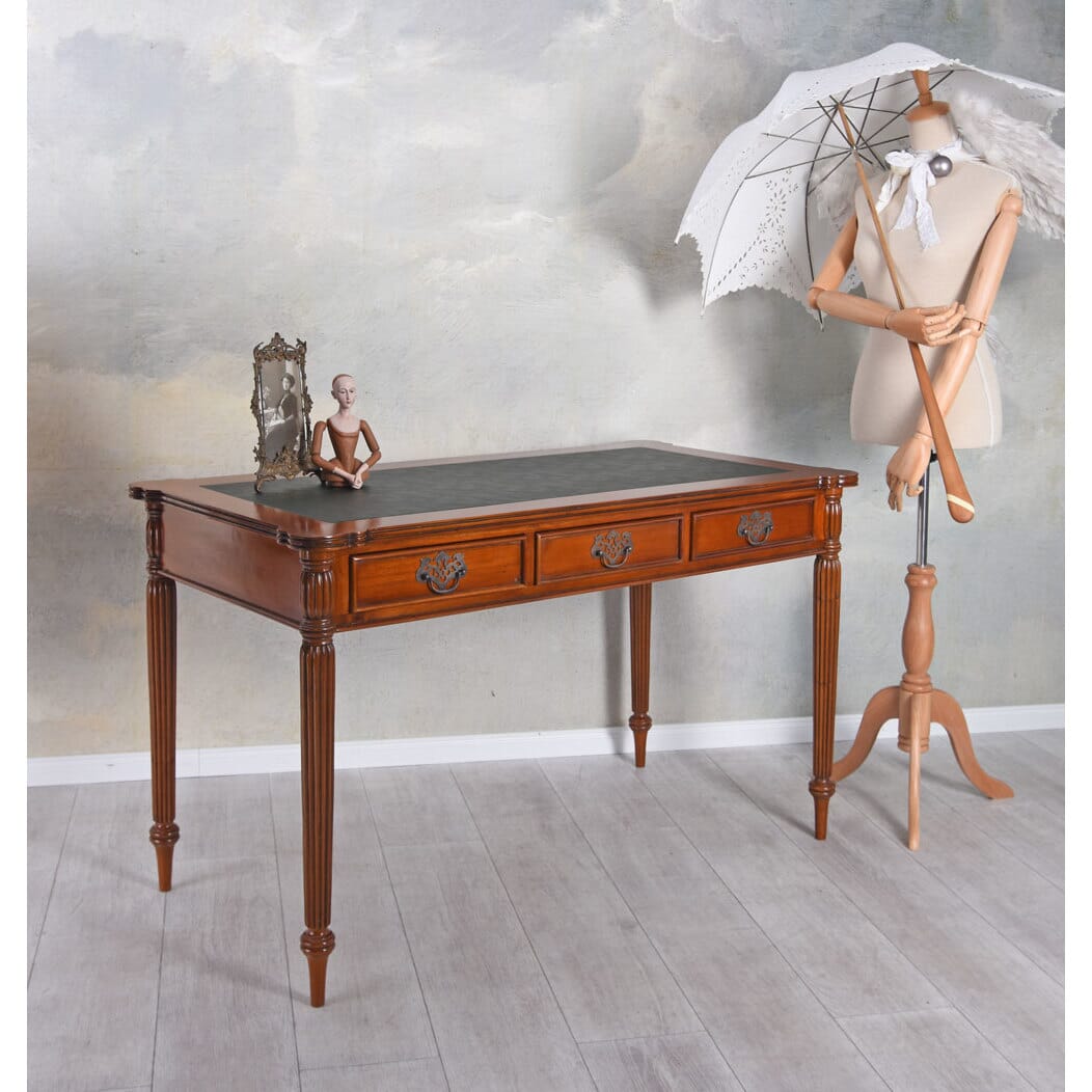 Material: massives Mahagoniholz, Pultplatte aus hochwertigem Kunstleder & drei geräumige Schubladen.