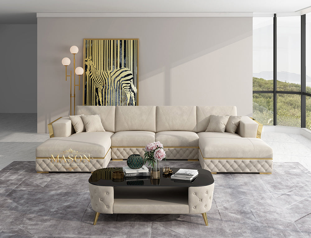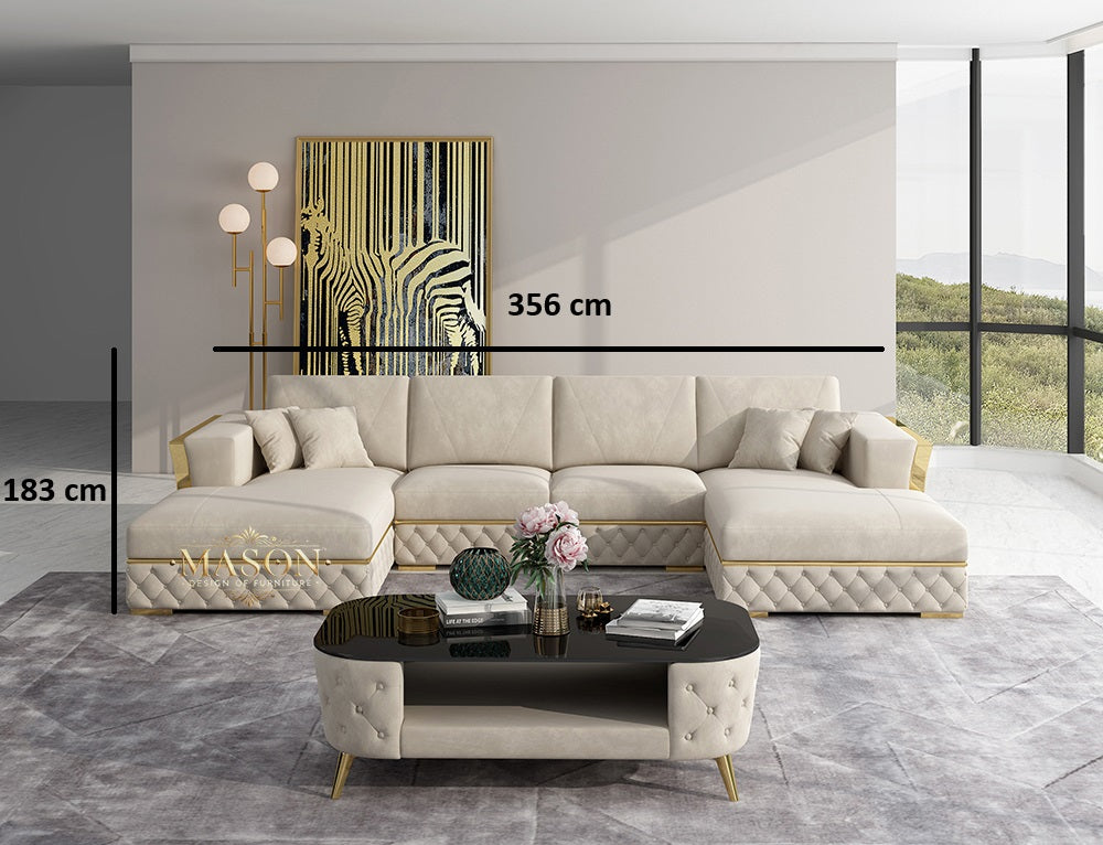 Dieses exquisite Sofa kombiniert modernes Design mit luxuriösem Komfort und passt perfekt in jedes stilvolle Wohnambiente. Der hochwertige Samtstoff in elegantem Beige verleiht Ihrem Raum eine edle und einladende Atmosphäre. Mit seiner großzügigen U-Form bietet das Sofa ausreichend Platz für Familie und Gäste, während die weiche Polsterung höchsten Sitzkomfort gewährleistet.