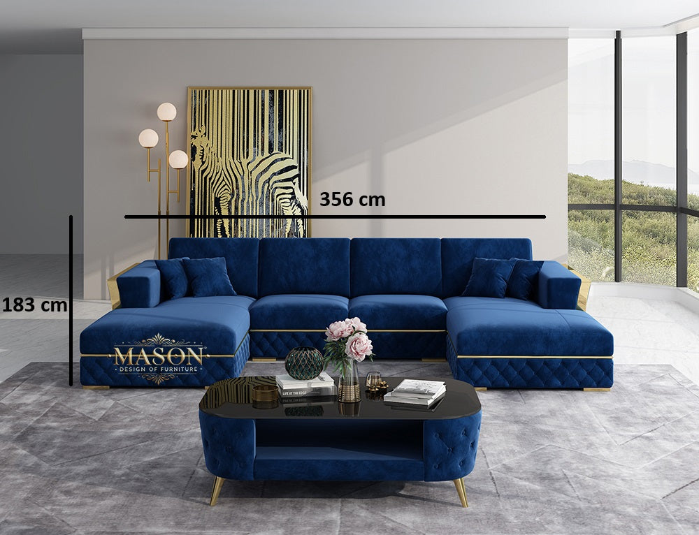 Dieses exquisite Sofa kombiniert modernes Design mit luxuriösem Komfort und passt perfekt in jedes stilvolle Wohnambiente. Der hochwertige Samtstoff in elegantem Blau verleiht Ihrem Raum eine edle und einladende Atmosphäre. Mit seiner großzügigen U-Form bietet das Sofa ausreichend Platz für Familie und Gäste, während die weiche Polsterung höchsten Sitzkomfort gewährleistet.