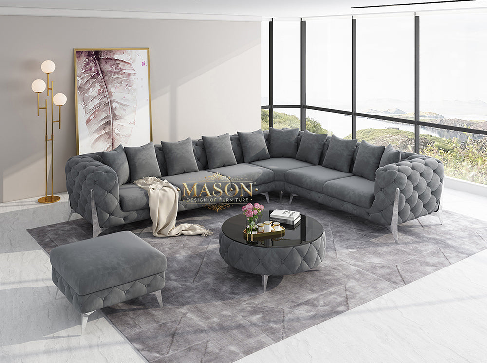 Dieses exquisite Sofa kombiniert modernes Design mit luxuriösem Komfort und passt perfekt in jedes stilvolle Wohnambiente. Der hochwertige Samtstoff in elegantem Grau verleiht Ihrem Raum eine edle und einladende Atmosphäre. Mit seiner großzügigen L-Form bietet das Sofa ausreichend Platz für Familie und Gäste, während die weiche Polsterung höchsten Sitzkomfort gewährleistet.