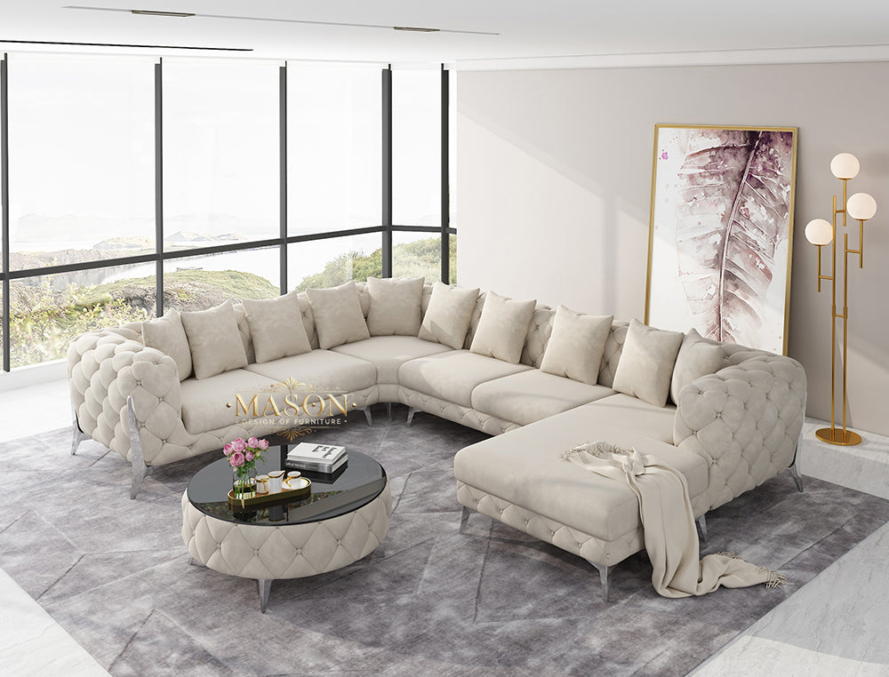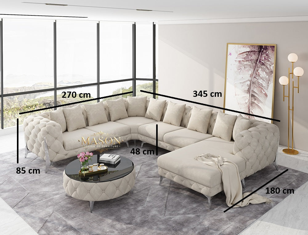 Dieses exquisite Sofa kombiniert modernes Design mit luxuriösem Komfort und passt perfekt in jedes stilvolle Wohnambiente. Der hochwertige Samtstoff in elegantem Beige verleiht Ihrem Raum eine edle und einladende Atmosphäre. Mit seiner großzügigen U-Form bietet das Sofa ausreichend Platz für Familie und Gäste, während die weiche Polsterung höchsten Sitzkomfort gewährleistet.