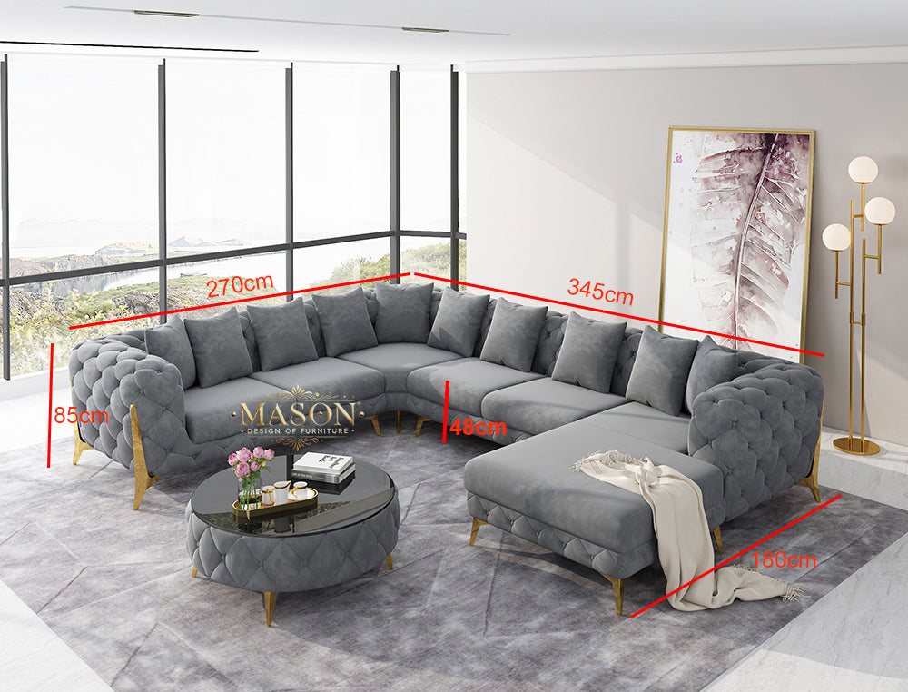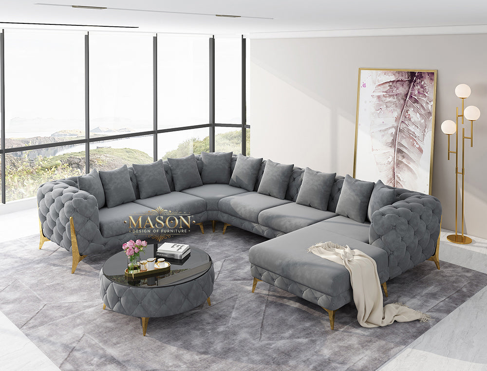 Dieses exquisite Sofa kombiniert modernes Design mit luxuriösem Komfort und passt perfekt in jedes stilvolle Wohnambiente. Der hochwertige Samtstoff in elegantem Grau verleiht Ihrem Raum eine edle und einladende Atmosphäre. Mit seiner großzügigen U-Form bietet das Sofa ausreichend Platz für Familie und Gäste, während die weiche Polsterung höchsten Sitzkomfort gewährleistet.