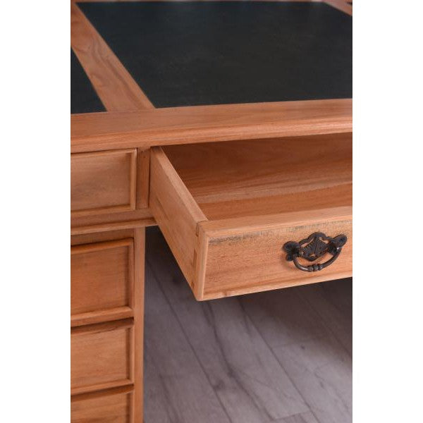 Aus massivem, naturbelassenem Mahagoniholz & Schreibeinlage in Leder- Optik.