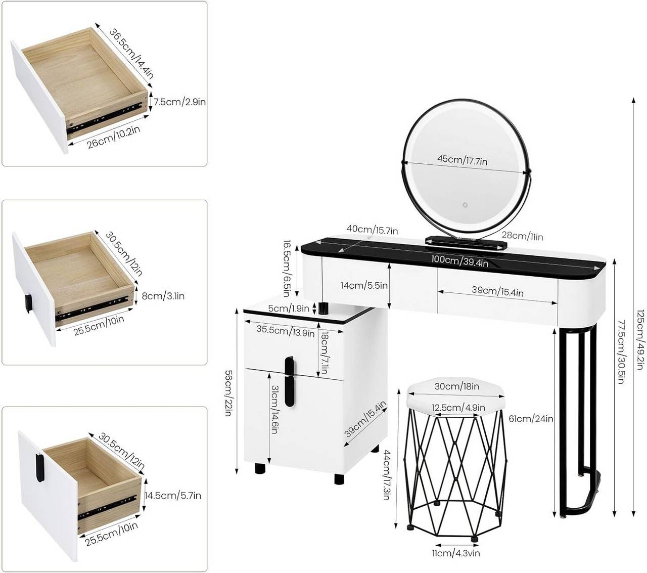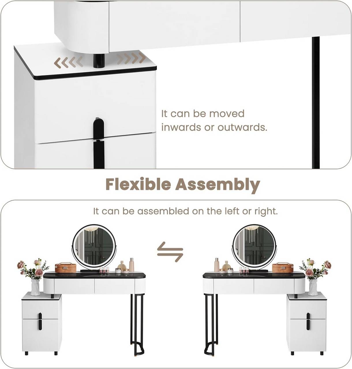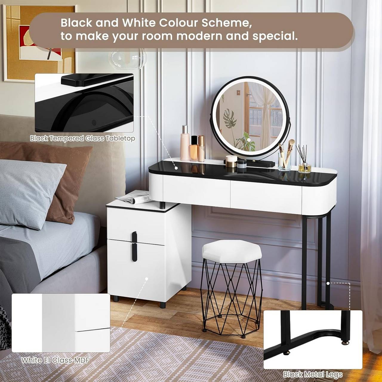 MODISCH & VIELSEITIG: Mit klassischer schwarz-weißer Farbgebung und einzigartiger Konstruktion bringt das minimalistische Set einen Hauch von Mode und Eleganz in eine Vielzahl von Einrichtungsstilen. Ohne Spiegel dient es auch als Schreibtisch- und Stuhl.