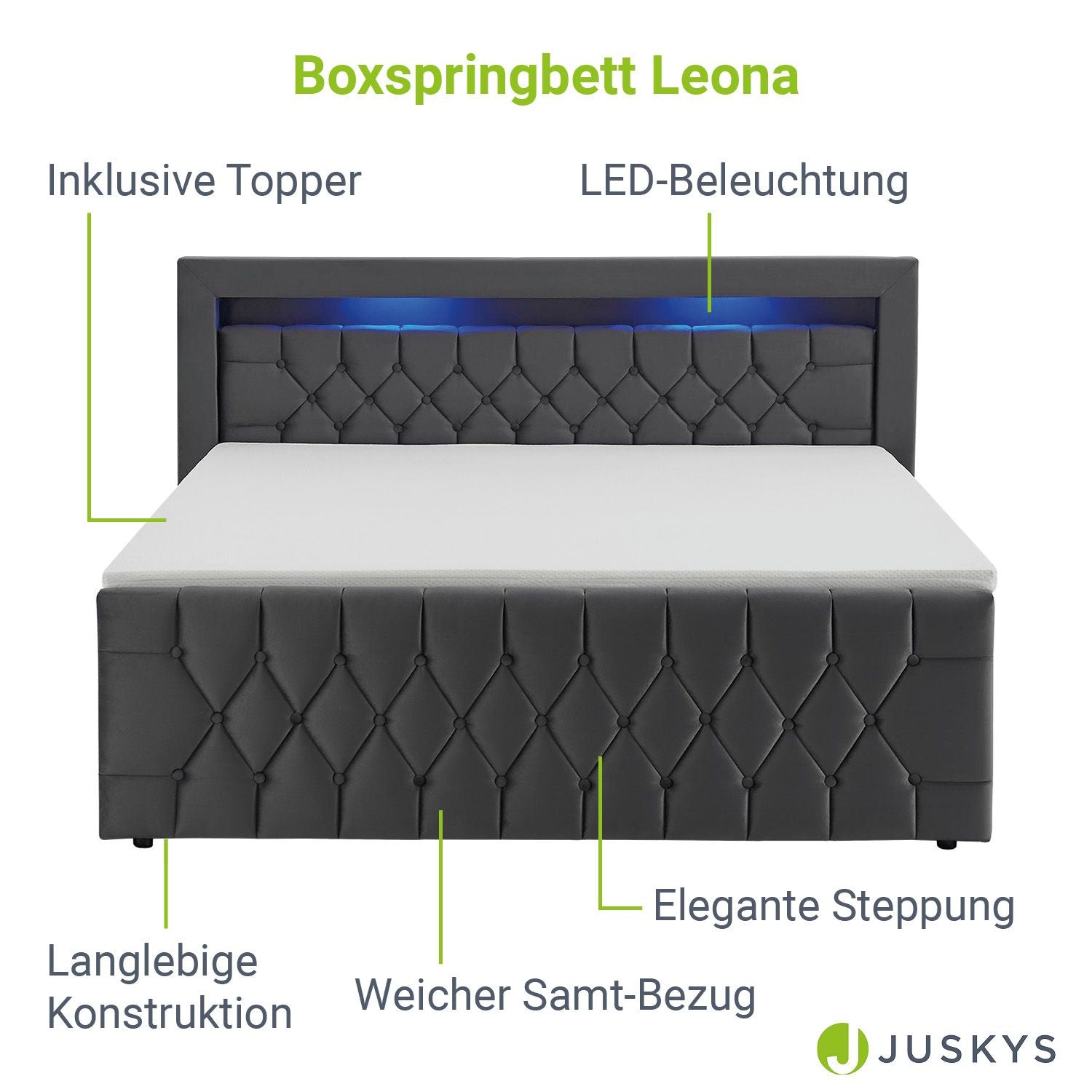 Das Boxspringbett (140x200 cm) mit Samtbezug in Grau bietet Ihnen höchsten Liegekomfort für Ihr Schlafzimmer. Die Kombination aus Bettkasten, H4-Matratze und weichem Topper sorgt nicht nur für eine angenehme Liegehöhe, sondern auch für traumhaften Schlaf. Die stimmungsvolle LED-Beleuchtung im Kopfteil und der weiche Samt-Bezug mit stilvoller Steppung runden das moderne Bett ab. Holen Sie sich jetzt das luxuriöse und samtig weiche Boxspringbett Leona für pure Entspannung und erholsamen Schlaf.
